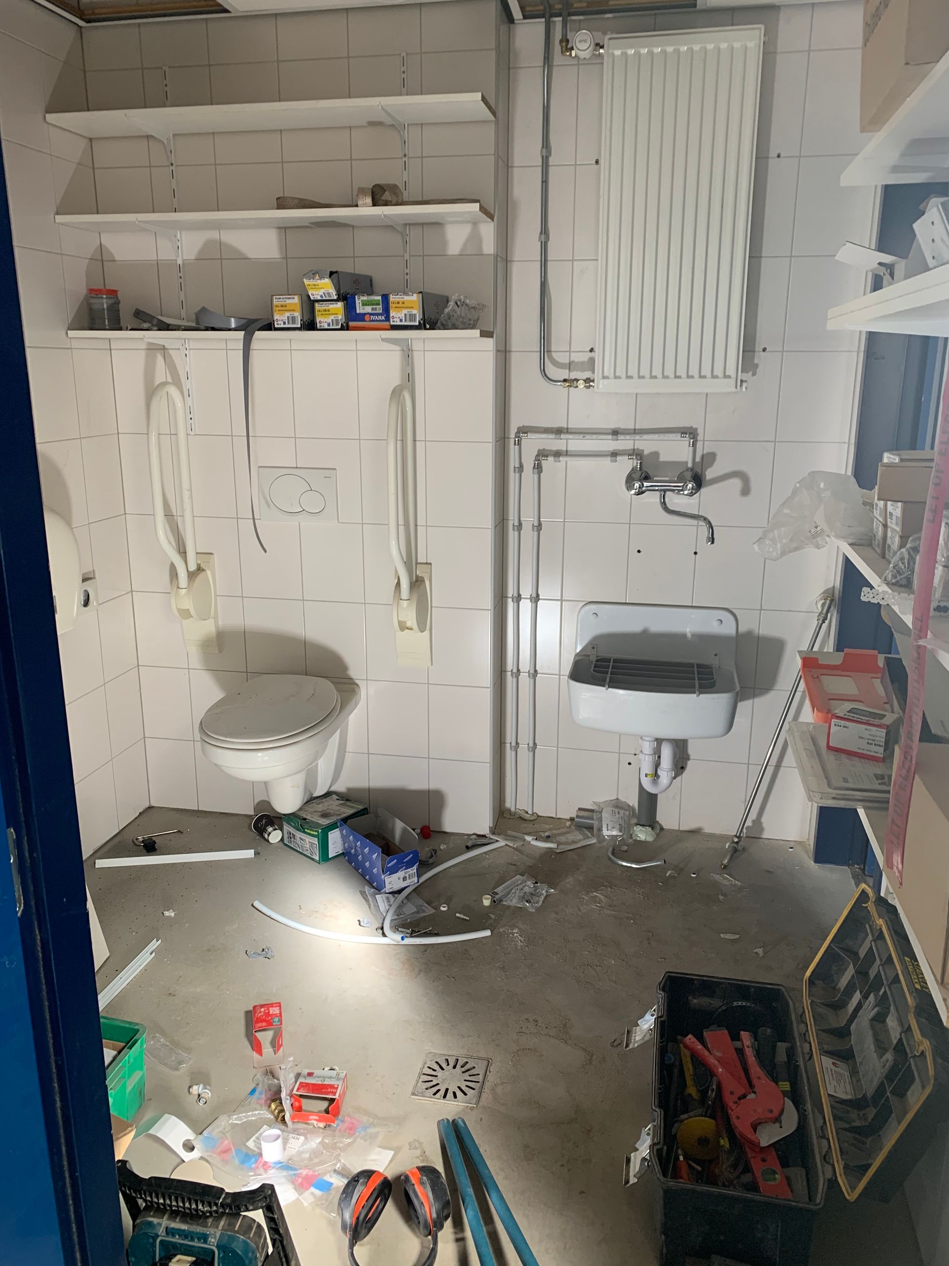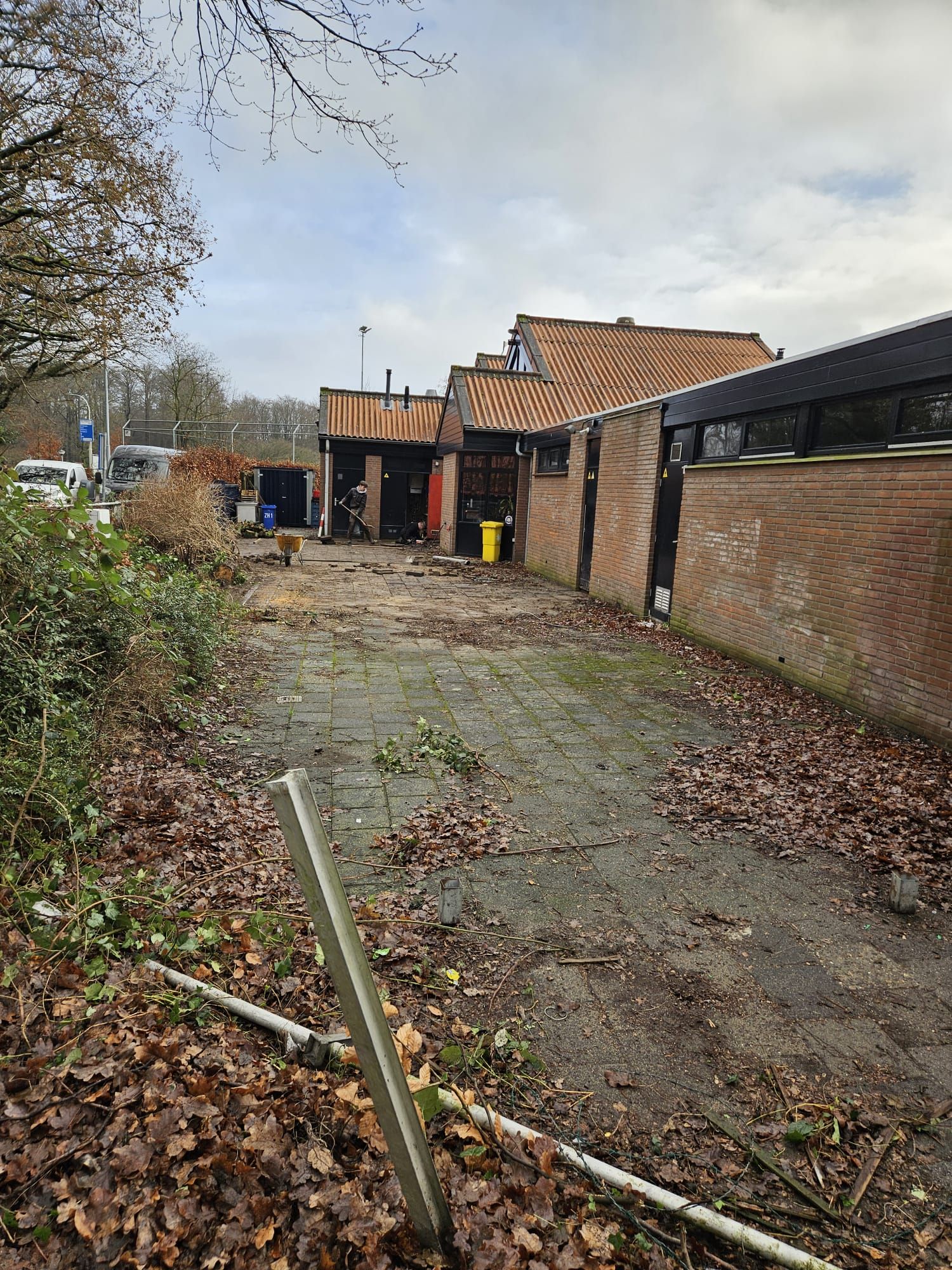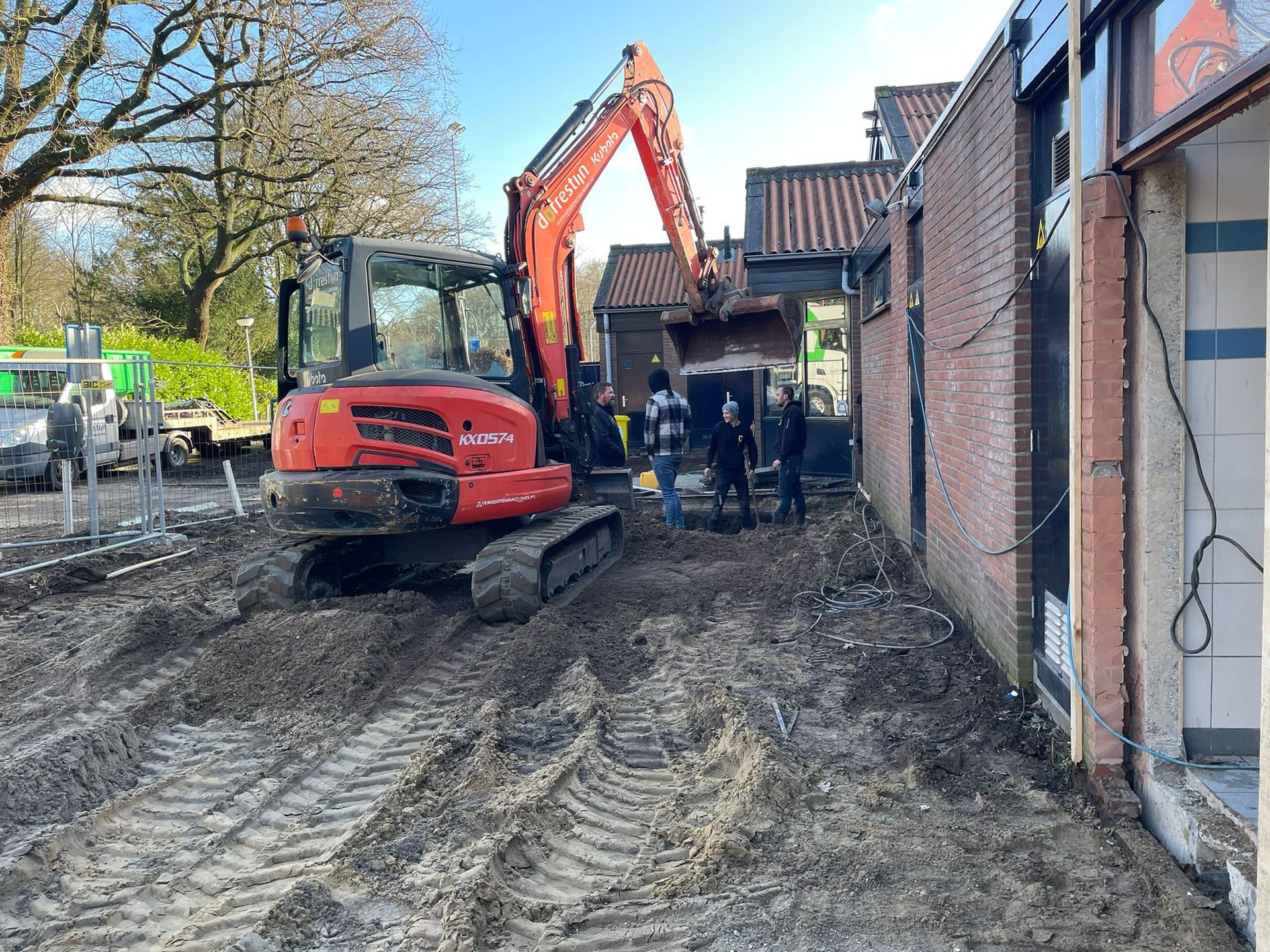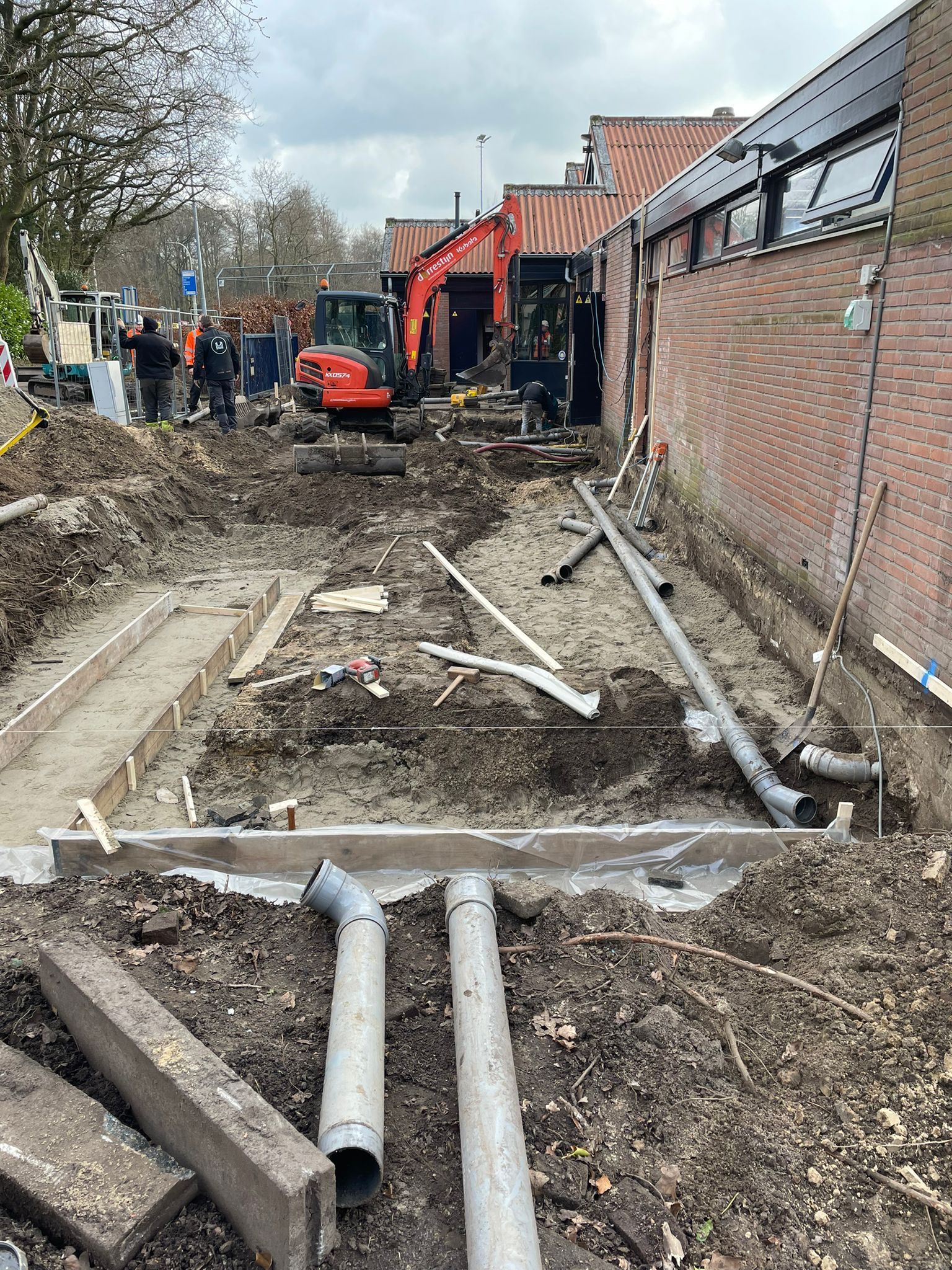 Doordat hier de tijdelijke portocabins met de kleedkamers stonden en heel wat struiken, zag je niet hoe groot deze oppervlakte eigenlijk was. Maar hier zijn dus de nieuwe kleedkamers en toiletten gemaakt! Gelijktijdig is de riolering goed aangepakt, om problemen uit het verleden voor eens en altijd opgelost te hebben.