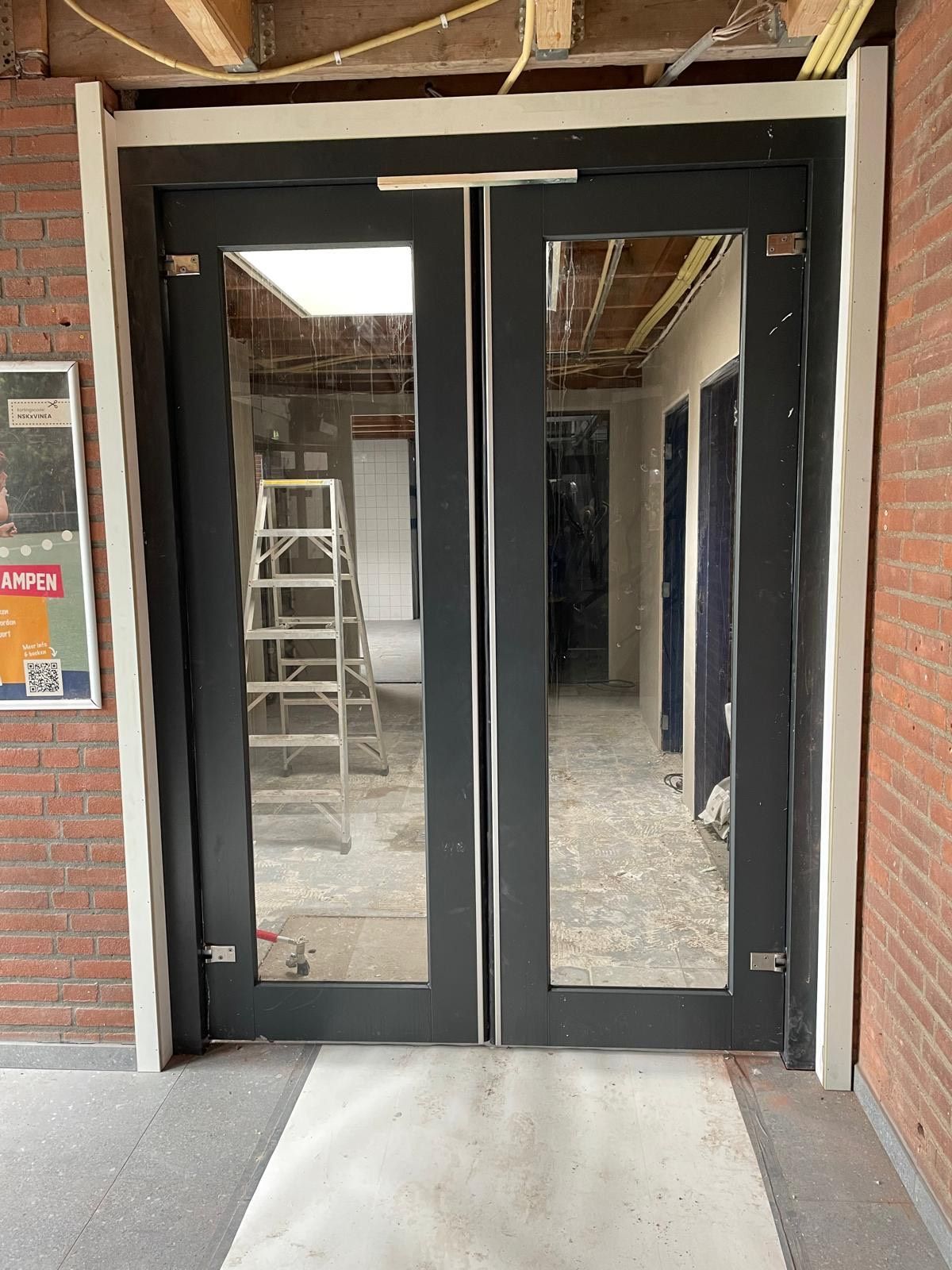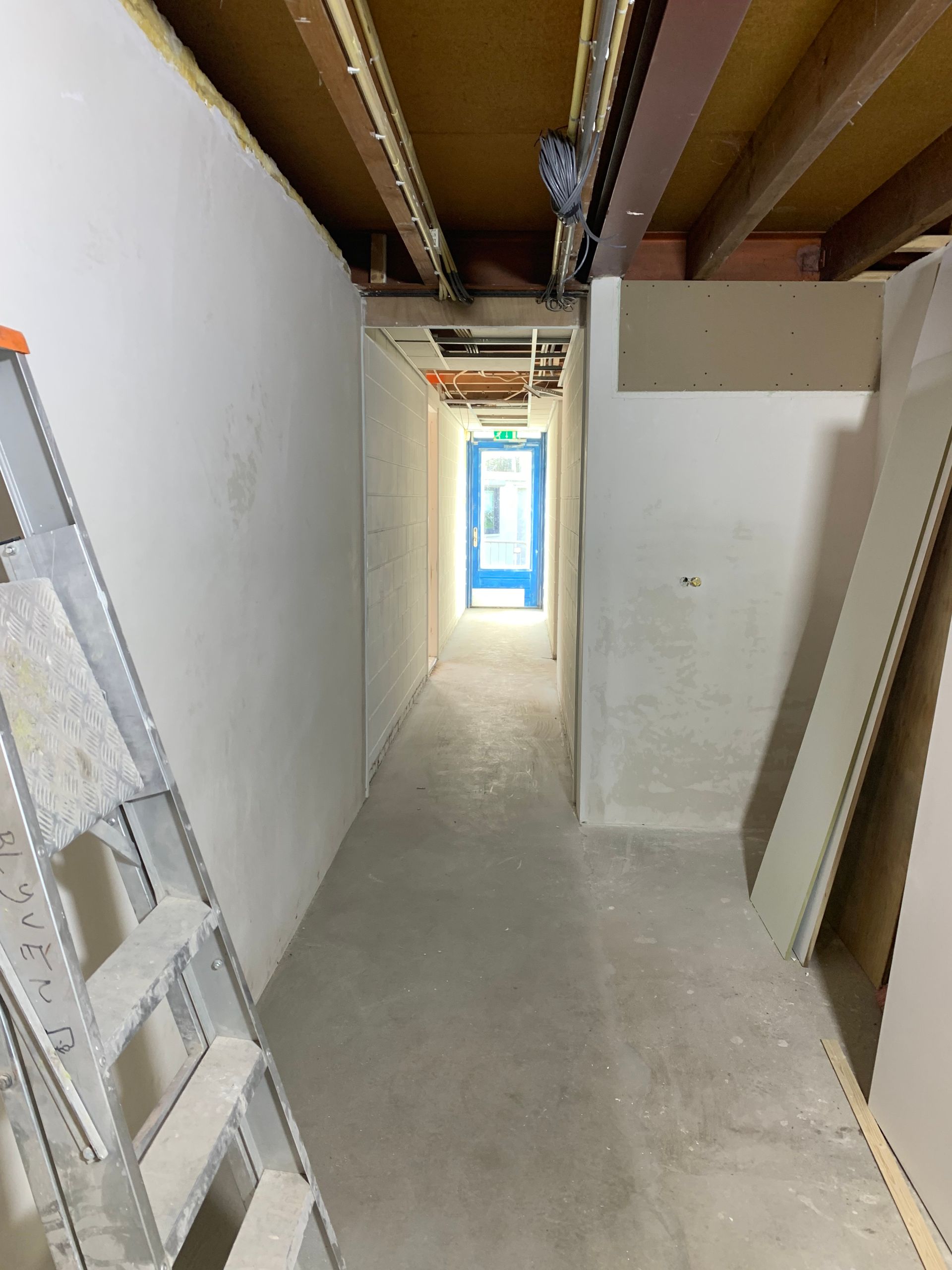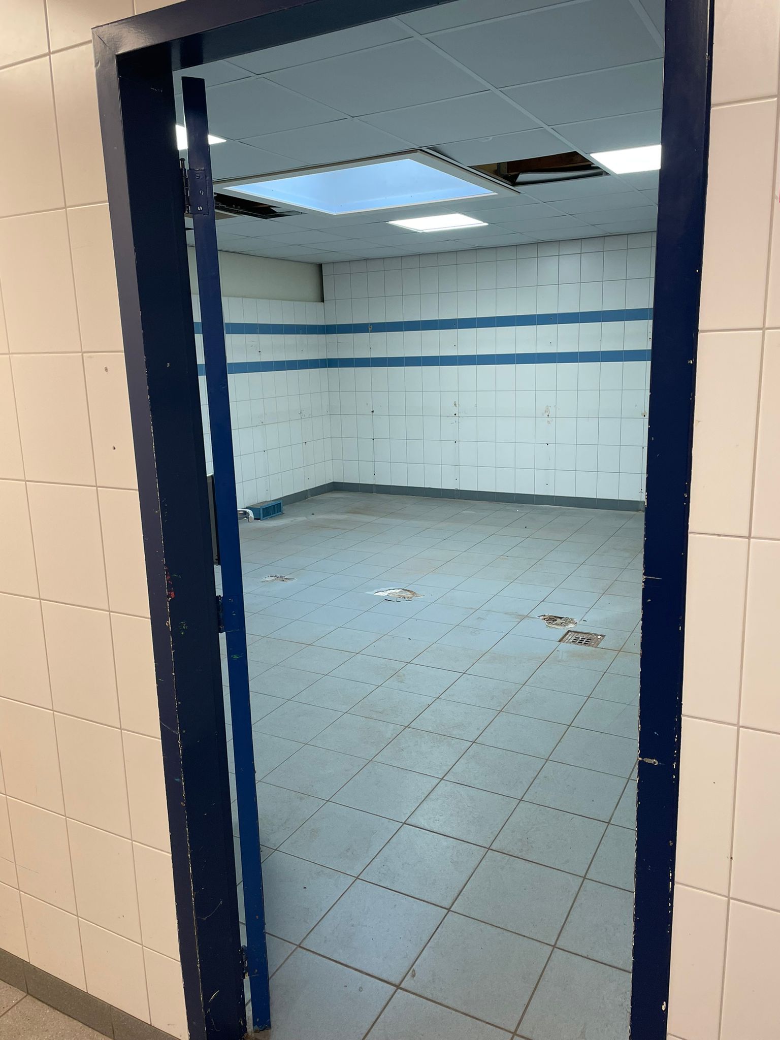 De hal is vergroot door de twee muurtjes van de bestaande kleedkamers wat meer naar achter te plaatsen. Hierdoor is er meer ruimte ontstaan in deze looproute. De oude lockers zijn mee met de ijzerboer. Tevens is er een goede doorgang waar straks de scheidsrechtersjasjes komen te hangen en de koelkast met ijs. Tevens is het mindervaliden toilet ook weer helemaal bruikbaar (dat was nl. een soort opslaghok geworden) en voorzien van een verschoonplank voor babies.