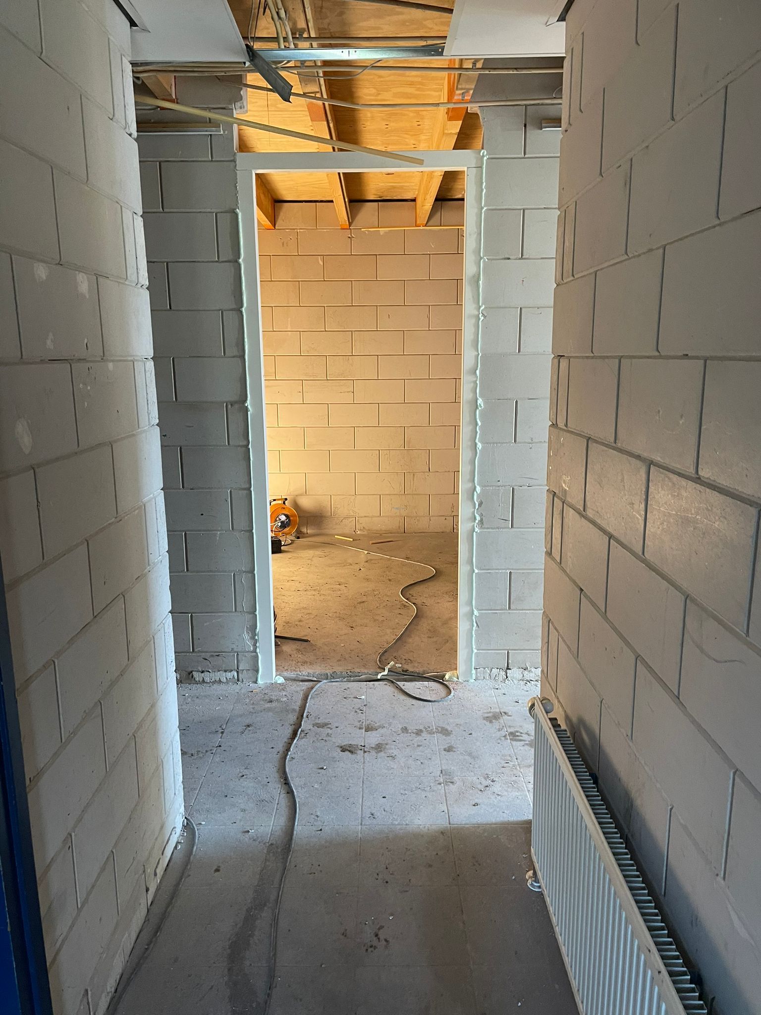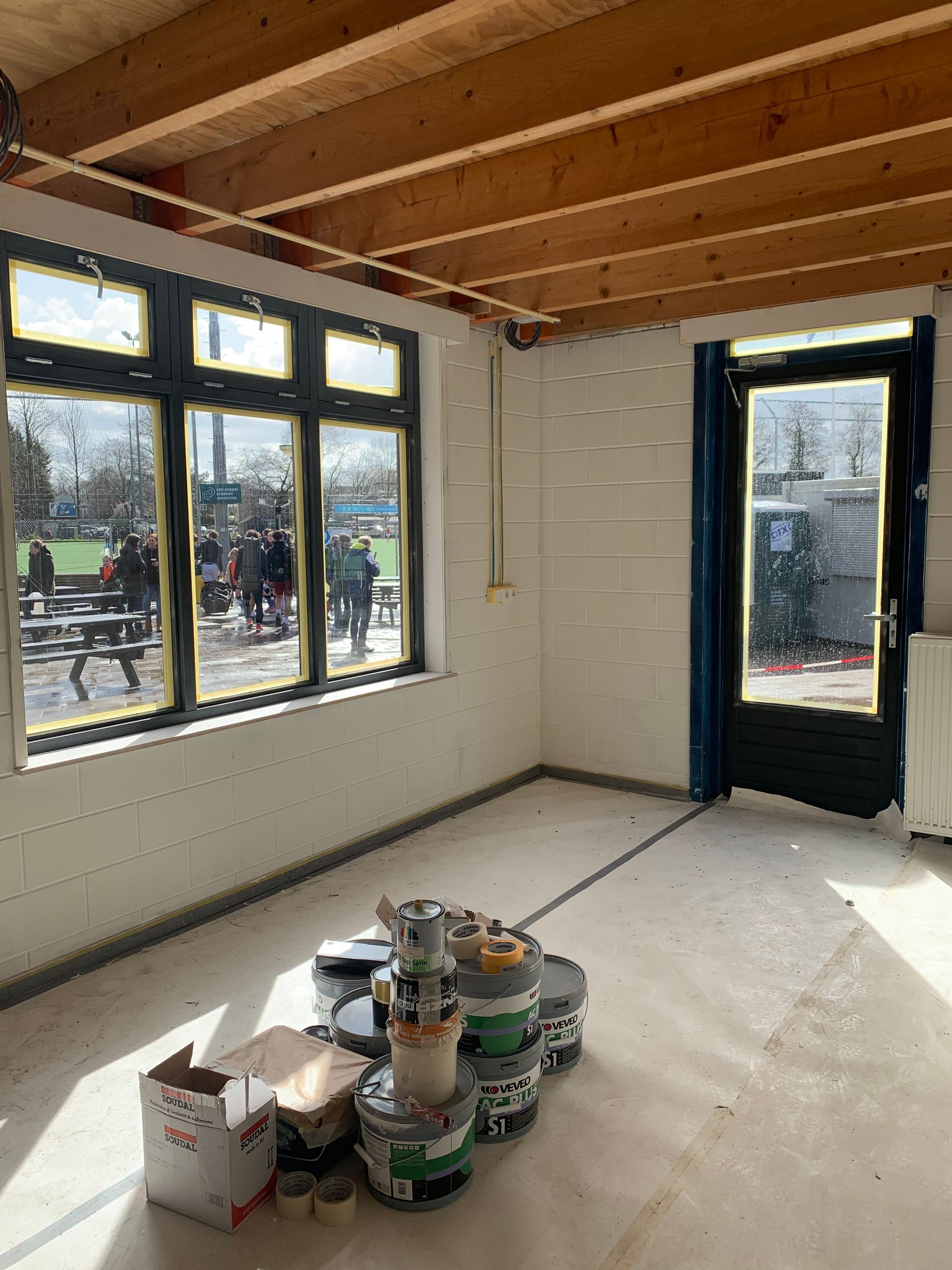 In het voormalige keepershok is nu de multifunctionele trainersruimte. Van alle gemakken straks voorzien, zodat onze trainers zich kunnen voorbereiden op hun trainingen, beoordelingen, besprekingen en meer. Maar ook een maaltijd kunnen maken in de pantry. Zowel van buiten als via een nieuwe deur in de lange gang kom je deze ruimte binnen. Het raamkozijn brengt een boel licht naar binnen.