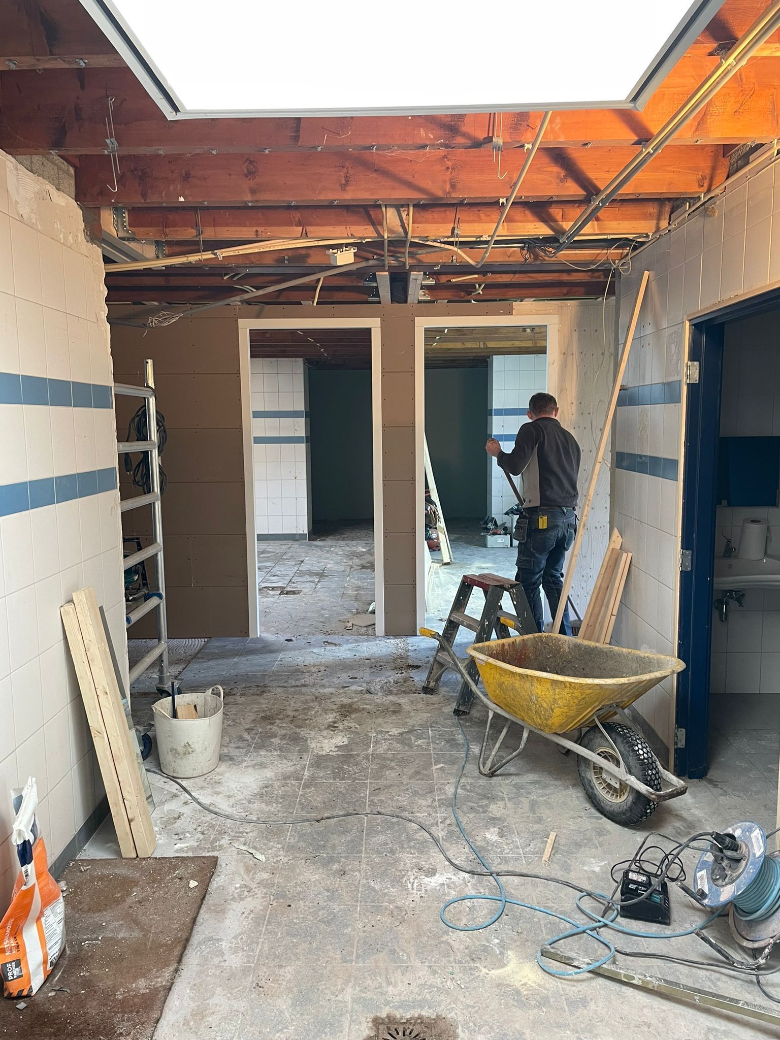 De oude kleedkamers zijn helemaal ontmanteld en leeggehaald door de kluscommissie. Ze zijn voorzien van nieuwe douches en een wastafel. De kleedkamers zijn wel iets kleiner dan ze waren, omdat in de praktijk blijkt dat maar 1 team tegelijk een kleedkamer gebruikt. Ook is alles opnieuw betegeld en zijn er nieuwe kleedkamerbanken.