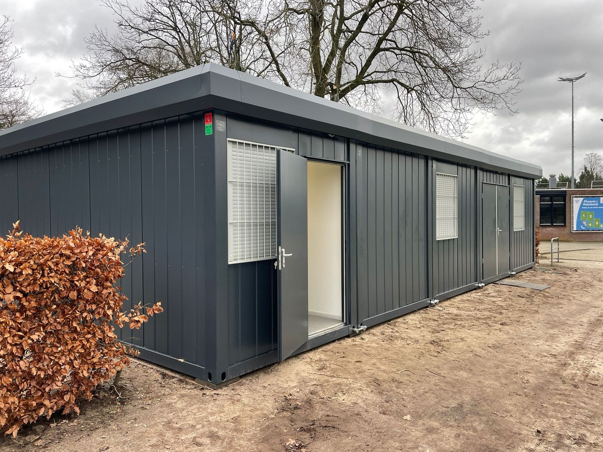 Kaal dat is het nu wel. Maar straks herken je het vast niet meer terug. De materialen voor de gevelbekleding zijn inmiddels uitgezocht. Dit worden onderhoudsvrije latjes in een lichte teak kleur. Dit is een mooie combinatie met de mobiele units die donkergrijs zijn. Zo wordt straks alles mooi een geheel en gecombineerd met genoeg groene beplanting. Op dit moment wordt er een ontwerp gemaakt voor de nieuwe entree en het fietsenplein.